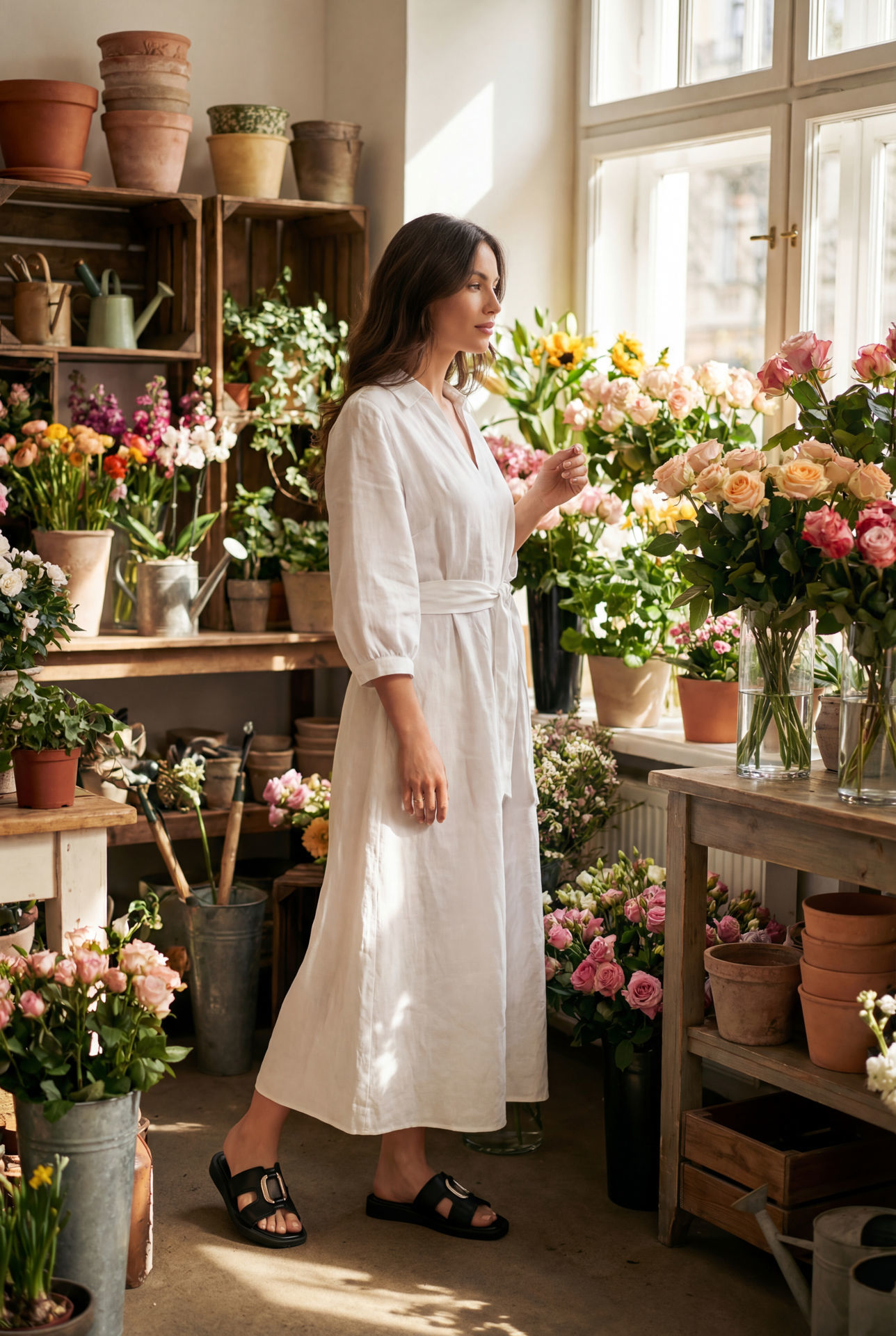 雙寬帶設計 搭配 金色金屬裝飾扣,展現簡約卻不失時尚的風格。厚底鞋身提供穩定支撐,柔軟鞋墊帶來舒適腳感,適合長時間穿著。黑色鞋面低調百搭,細緻車縫線增添質感與耐用度,讓休閒穿搭更顯精緻。 特色亮點 鞋面:雙寬帶設計,搭配金屬裝飾扣 鞋墊:柔軟緩衝,舒適貼合 鞋底:穩定耐磨 風格:簡約黑色,時尚百搭 功能:休閒舒適,適合日常穿著 Designed for both comfort and style, this black slide sandal features two wide faux leather straps joined by a bold metallic buckle in a gold tone. The cushioned footbed provides lasting comfort, while the thick sole ensures stability and durability for everyday wear. The sleek black finish with fine detailing makes it versatile enough for casual outings or relaxed city strolls. Key Features Upper: Two wide straps with decorative metallic buckle Footbed: Soft cushioned insole for comfort Sole: Durable outsole for stability Style: Minimalist yet chic black design Function: Perfect for casual wear, summer outings, or daily comfort