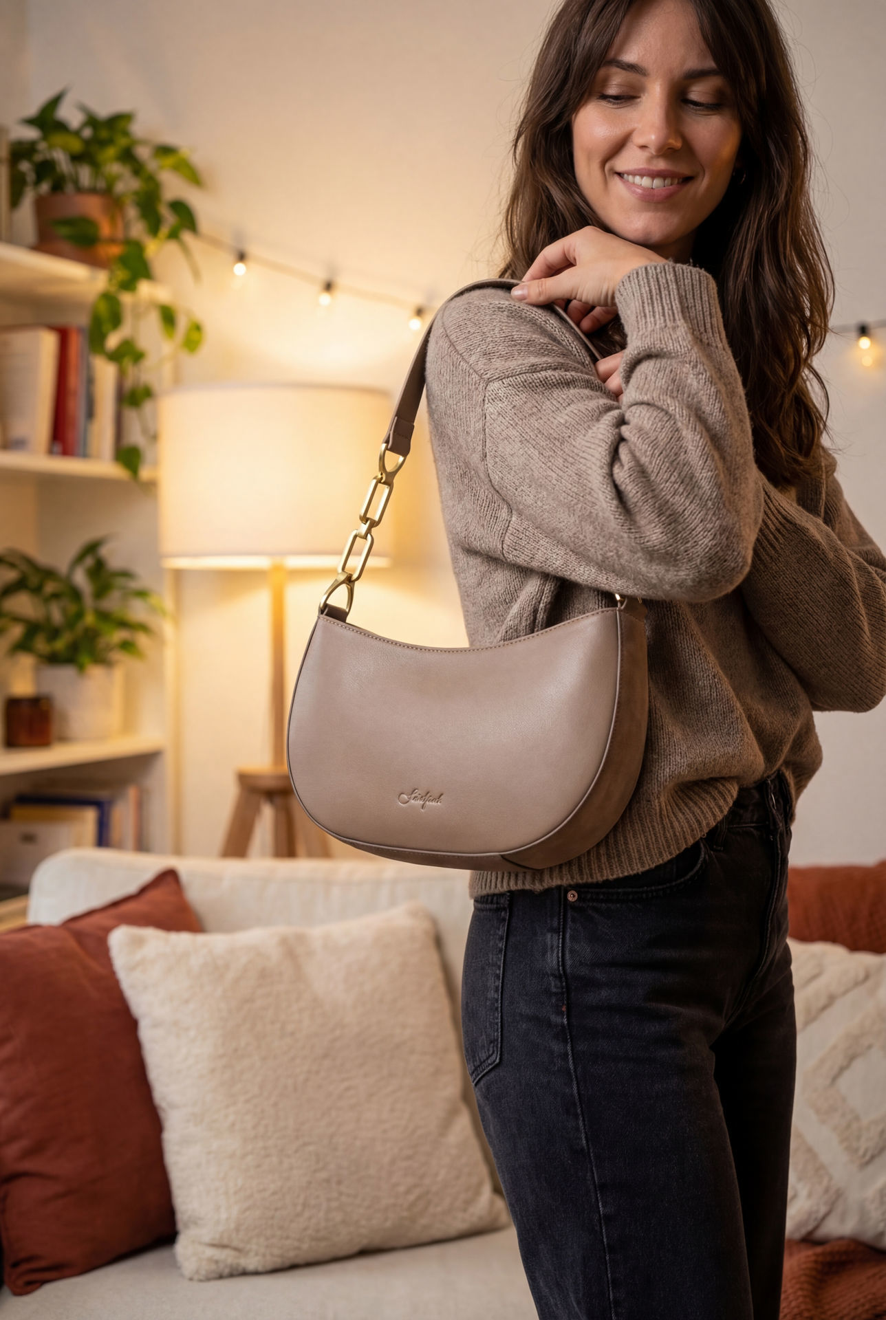 以柔滑人造皮打造,正面壓印 Footspot 品牌標誌,展現低調奢華。獨特的新月形設計搭配皮革與金色鏈條肩帶,兼具時尚與實用。寬敞的內層空間,讓日常收納更輕鬆,無論休閒或正式場合都能完美駕馭。 Footspot Crescent Shoulder Bag Crafted from smooth faux leather with the Footspot logo embossed on the front, this bag exudes understated elegance. The unique crescent silhouette is paired with a strap that combines leather and gold-toned chain links, striking the perfect balance between style and practicality. With a spacious interior, it makes everyday organization effortless — ideal for casual outings, office looks, or semi-formal occasions.