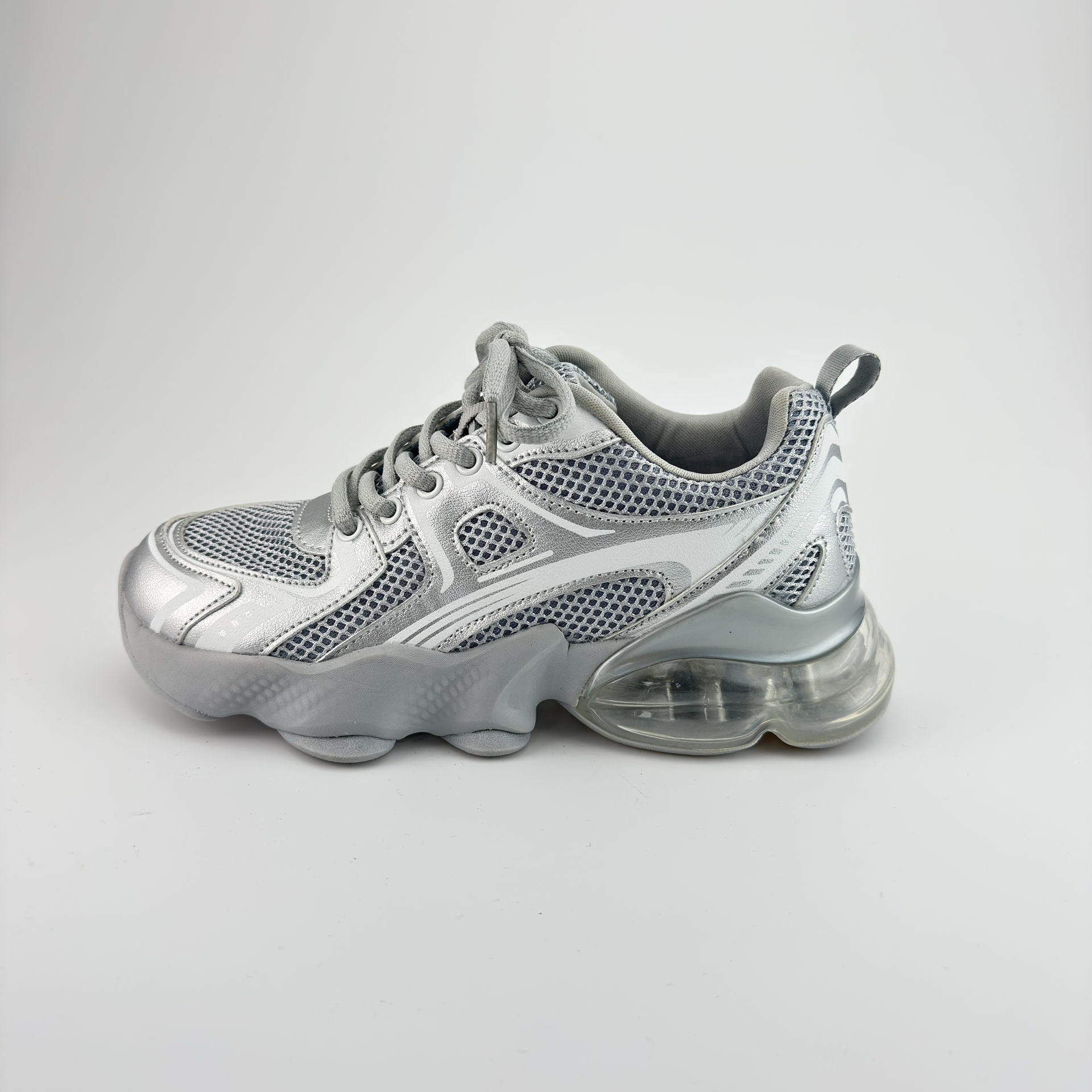 Product Description Style: The shoe features a chunky, fashionable design with a thick, elevated sole. It is often referred to as a "daddy shoe" or "platform sneaker". Materials: The upper part of the shoe is made of a breathable mesh fabric with high-peeling overlays, which are typically synthetic materials like PU (polyurethane). The sole is often made of rubber or MD (a type of foam) and may include an air cushion for cushioning and flexibility. Features: The design is intended to be lightweight, non-slip, and breathable, making it suitable for casual wear, walking, and running. The platform sole provides a heightening effect while ensuring stability. Color: The shoe in the image is black and silver. 產品描述 款式: 此款鞋採用厚底時尚設計,外型大方,鞋底加高,展現潮流風格。常被稱為「老爹鞋」或「厚底運動鞋」。 材質: 鞋面由透氣網布製成,搭配高耐磨的合成材質覆層(如 PU 聚氨酯),兼具舒適與耐用。鞋底通常使用橡膠或 MD(輕質泡棉)材質,並可能內含氣墊,提升緩震與靈活性。 特色: 設計輕盈、防滑、透氣,適合日常穿搭、散步或輕度運動。厚底設計不僅增高,亦提供穩定支撐。 顏色: 圖片中的鞋款為黑銀配色。